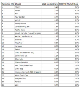 Last week we looked at California’s top-selling flower brands. For our new Chart of the Week, here’s another list from data shop Headset. This one’s the state brands with the biggest market share across categories, with a comparison to last year.