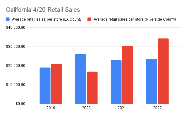 This week’s data, from point of sale software provider Cova, looks at 4/20 sales across its shops in two big SoCal counties. Recent same store growth looks especially strong in Riverside.