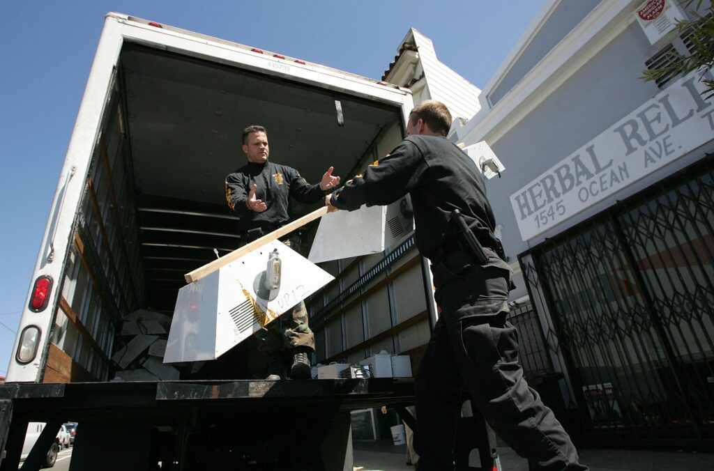 SAN FRANCISCO – JUNE 22: Federal law enforcement agents remove grow lights during a raid June 22, 2005 in San Francisco, California. The clubs raided today were opened after the deadline San Francisco Mayor Gavin Newsom enacted in March, banning all new medical marijuana clubs from opening. The U.S. Supreme Court recently ruled that Federal authorities may prosecute sick people whose doctors prescribe marijuana to ease pain, concluding that state laws don’t protect users from a federal ban on the drug. (Photo by Justin Sullivan/Getty Images)